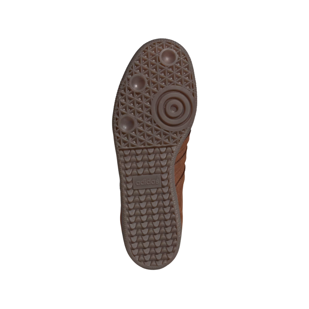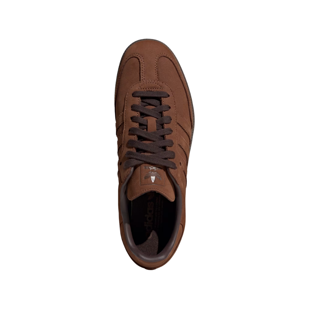 Nesta versão, o Samba OG apresenta uma combinação sofisticada de cores Preloved Brown (marrom), Almost Copper (detalhes em tom cobre) e solado Gum, criando um visual elegante e fácil de combinar com diferentes estilos. O cabedal em couro premium com sobreposição em camurça oferece durabilidade, conforto e acabamento refinado.
